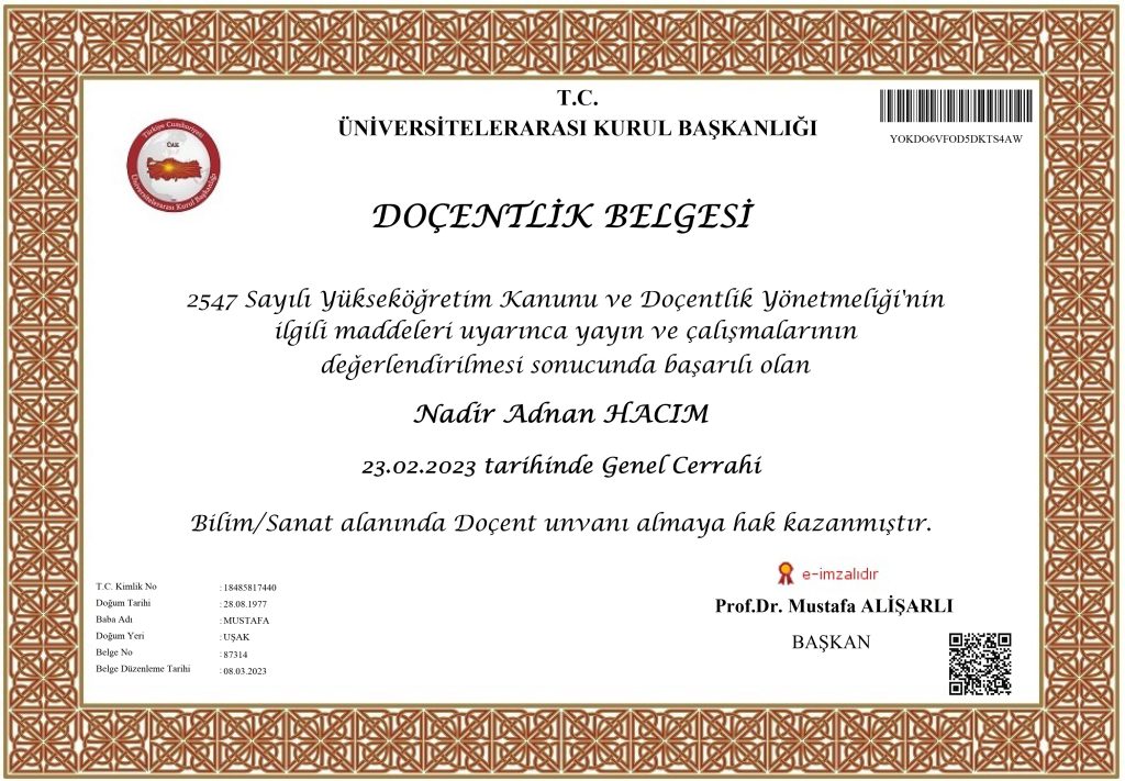 • Doçentlik: Şişli Etfal Eğitim ve Araştırma Hastanesi, Genel Cerrahi Doçenti – İSTANBUL